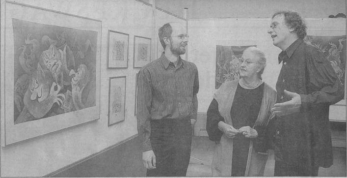 Stefan Kammerer, Elisabeth Kaiser-Arentz und Heiner Waniek (v.li.) unterhielten die Gäste im Heimatmuseum mit einer kurzweiligen Vernissage. Die Kulturgemeinde hat die Ausstellung mit Werken der Hückeswagener Künstlerin organisiert. Foto: Herbert Draheim